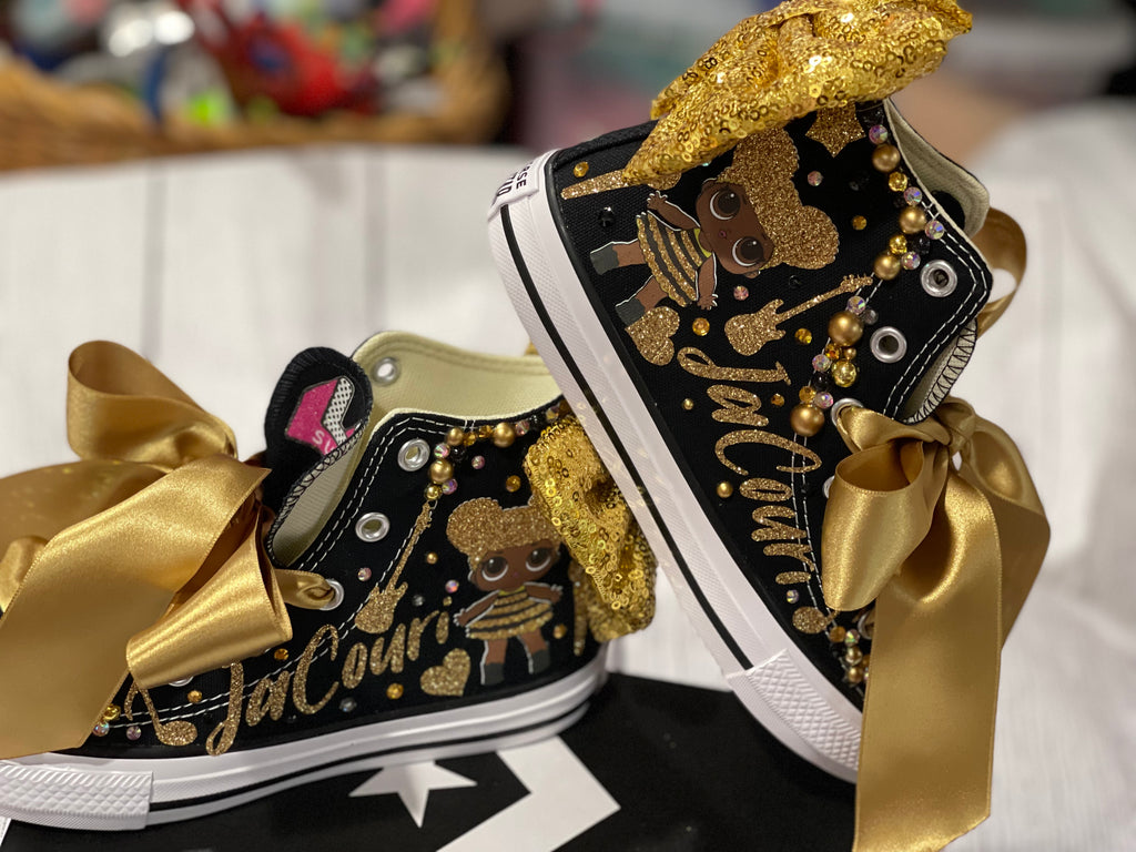 Custom decorated Suprise doll theme converse blinged out with super sparkly rhinestone designs and pearls.