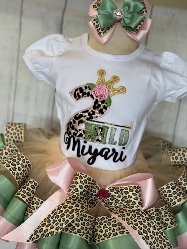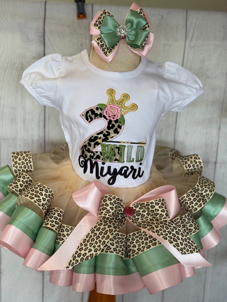 Into the wild theme Birthday Set This is a custom sewn set for Niyah. The shirt will have a number 2 with a crown with flowers Inc. and the letters wild next to it in a design with the child’s name below that in black, all in custom embroidery. The tutu will be in the color theme from the first picture with the tutu, including leopard print ribbon instead of giraffe as in the second picture. Some example pictures have been added to the listing for ideas. The back of the shirt will have the into the wild characters embroidered in gold thread.