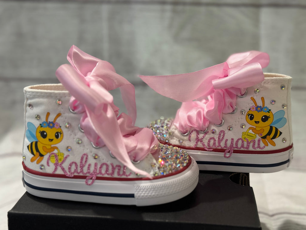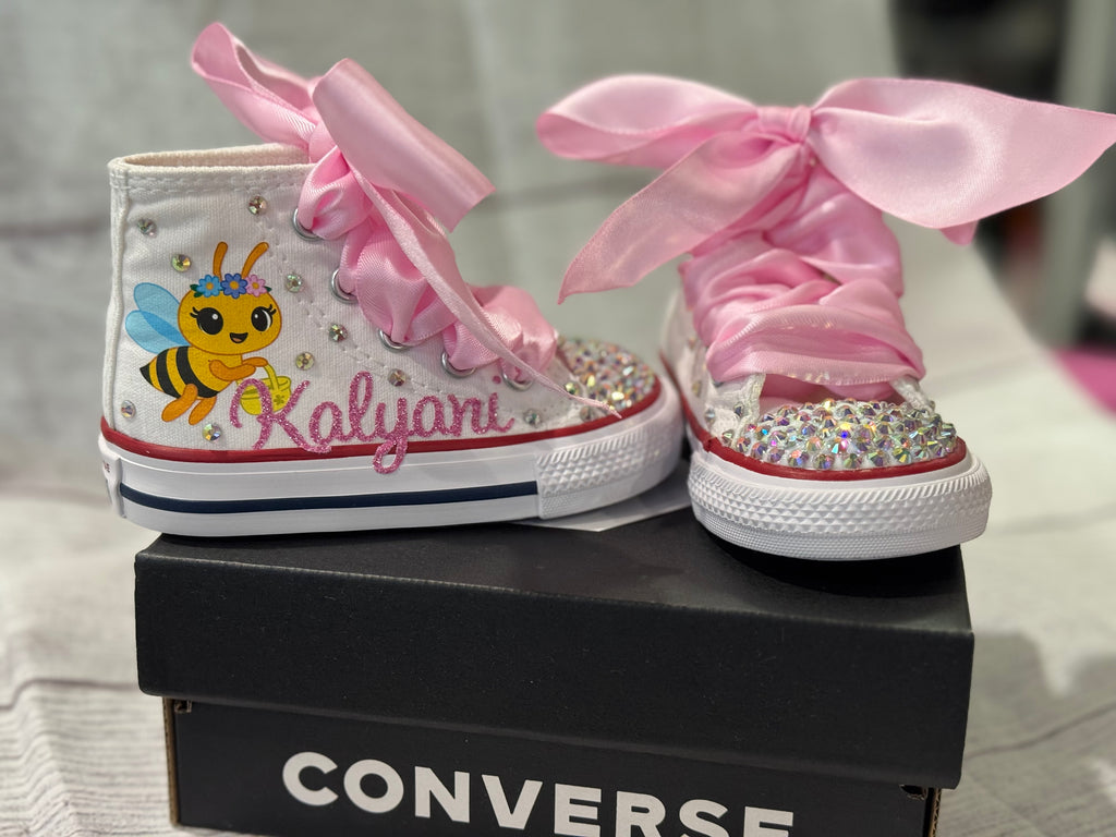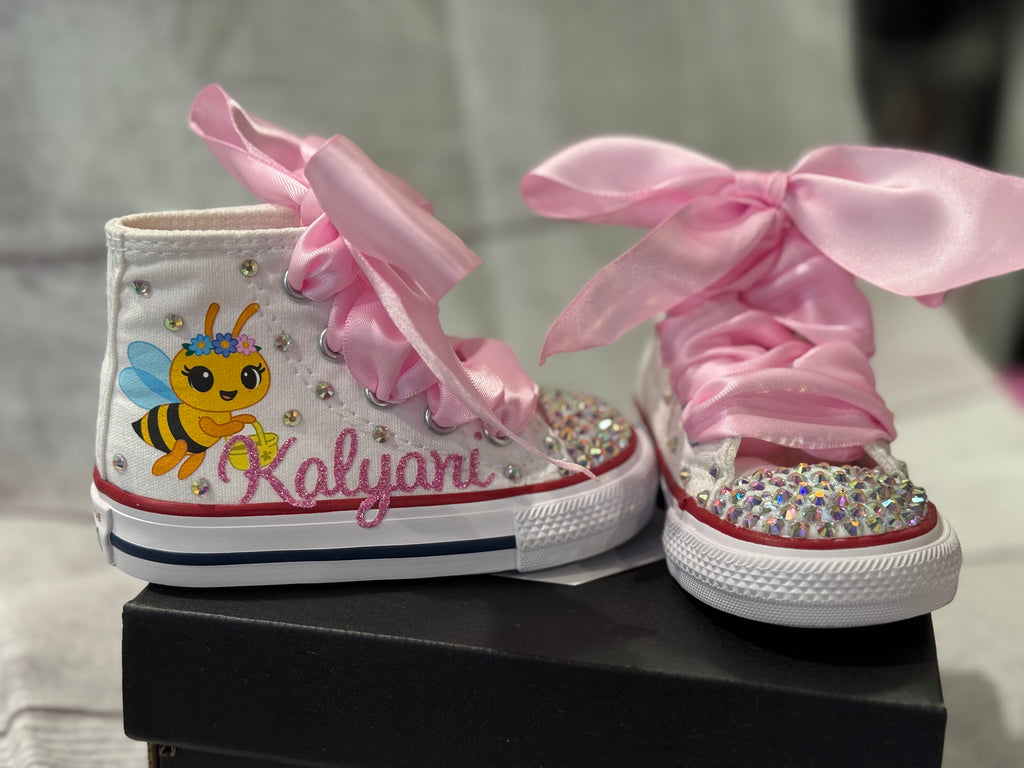 Custom decorated Bee theme converse blinged out with super sparkly rhinestone design. The shoes will have the design to match the outfit. Laces will be with ribbon.
